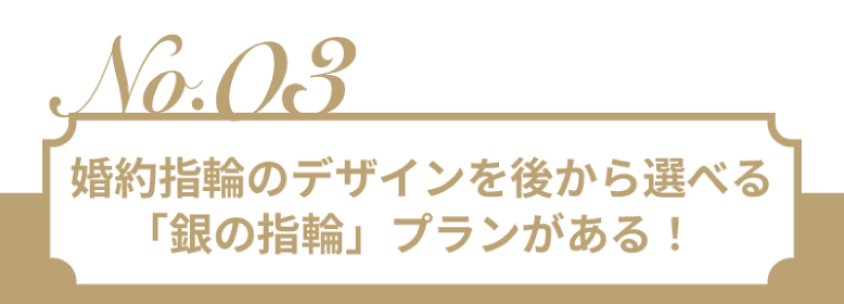 「婚約指輪を買いたいけど相手の好きなデザインじゃなかったらどうしよう…」「サイズが曖昧orわからない!」などの不安を解消してくれるのが【銀の指輪】プランです。